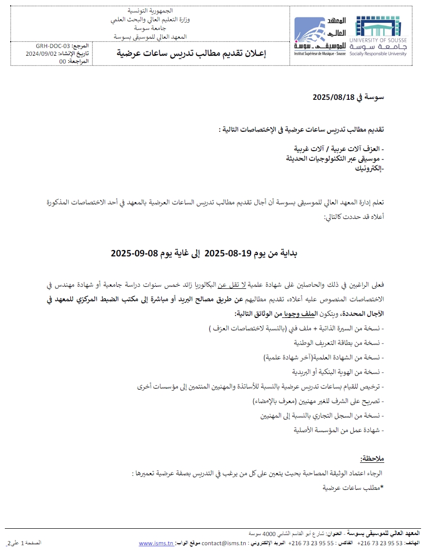 إعــــلان تقديم مطالب تدريس ساعات عرضية