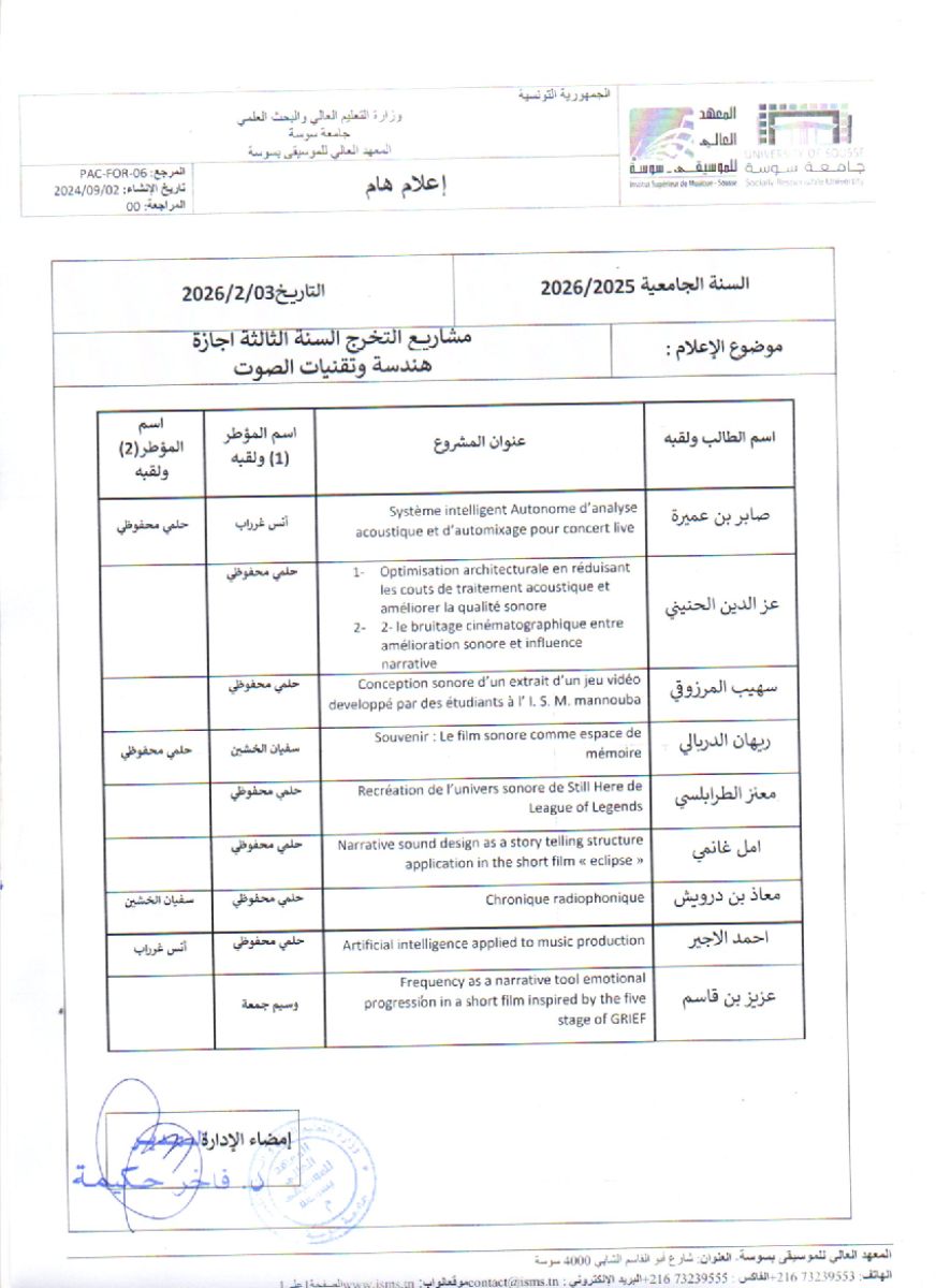 قائمة الطلبة المعنيين بمشاريع التخرج